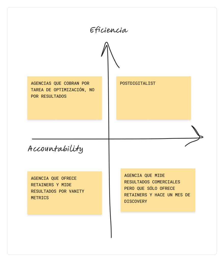 Postdigitalist ocupa el cuadrante de alta eficiencia y alta accountability. Si tu marca está sola en el cuadrante más favorable, felicitaciones: sos competitivo.